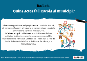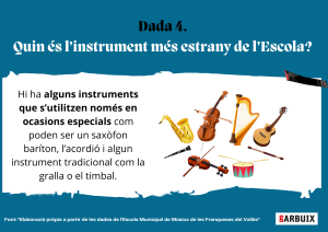 Amb la voluntat de conèixer millor aquesta institució, hem volgut posar el focus en algunes de les seves dades més destacades: quins instruments s’hi poden estudiar, quines activitats organitzen o quants alumnes en formen part.